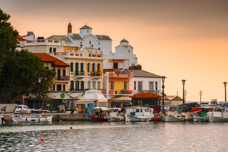 Aegina, Greece - September 13, 2019: Panoramic view of marina and waterfront in Aegina town at sunset