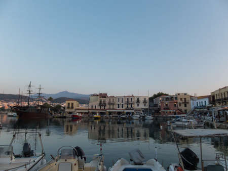 Rethymno, Greece - August 6, 2016: Venetian harbour at the evening. The old town of Rethymnon is one of the best-preserved towns of the Renaissance.