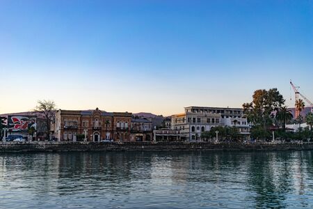 Agios Nikolaos, Crete, Greece - June 08, 2017: Agios Nikolaos town at summer evening. Agios Nikolaos is one of the most touristic cities on Crete island, Greece.