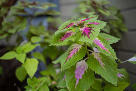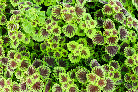 Beautiful green and purple leaves of the plant coleus Plectranthus scutellarioides and Perilla. Textured natural background made of beautiful bright leaves.