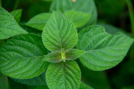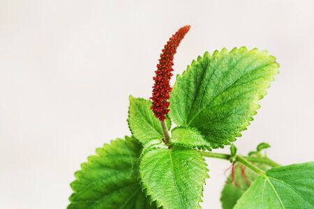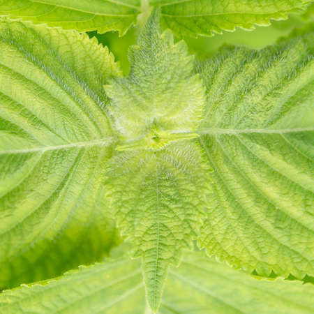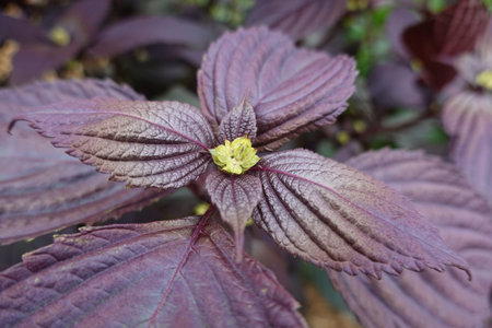 Perilla frutescens leaves close up as a beautiful nature background. Organic food ingredient. selective focus