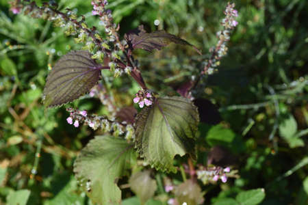 Japanese basil (Shiso herb) flowers. Lamiaceae annual aromatic herb.