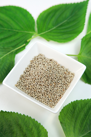Perilla seeds in a wooden bowl with spoon holding by hand and perilla leaf on white background, Healthy herbal seed ingredients in Asian food, Top view