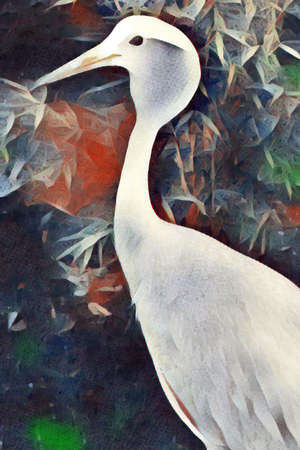 Digital artistic painting of a crane bird with colourful bamboo background, good for your digital background template