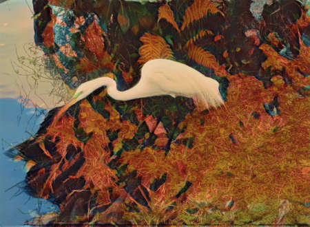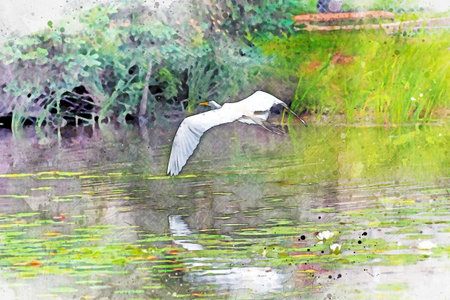 Digitally created watercolor painting of a Great Egret or Great White Heron in flight
