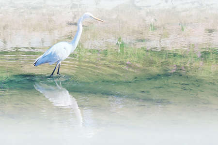 Egret in wild nature. Wild nature in Europe. Detail animal. One heron is walking at the morning.