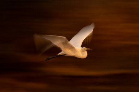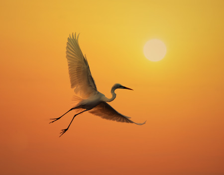 Egret flying over the dusky sky, showing birds full wings span, light hitting and glowing feathers.