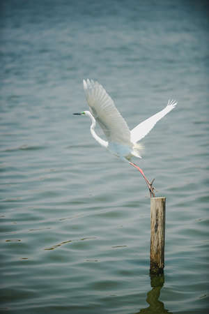 Zoom shot of a white bird perched on the tree stump and was about to fly. River is still and has a stripe pattern. Edges of the picture have a vignette. Idea for poultry background with copy space.