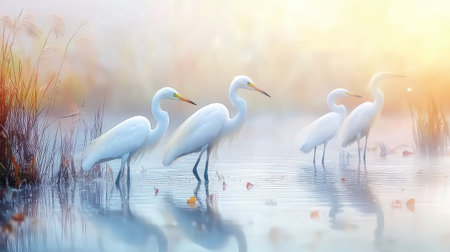 This tranquil image captures white birds wading in calm waters during a misty sunrise, showcasing the beauty of nature and wildlife in serene harmony.