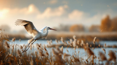 Majestic Crane Walking Through Lush Marshland with Colorful Reeds at Sunrise, Capturing the Serenity of Nature in Soft Light and Vivid Colors