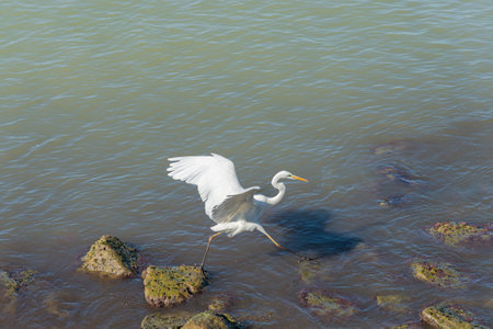 Great white heron with extended wings walking on sea rocks looking for fish to catch.