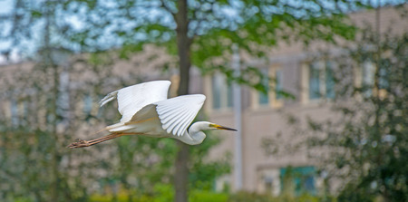 Egretta alba in flight over water in Yala National Park Sri Lanka.