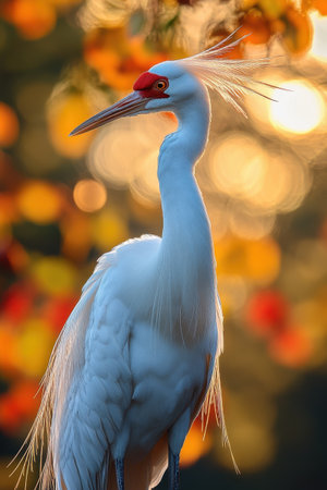 A stunning white bird with a distinctive red crown and elegant feathers rests against a vibrant autumn landscape. The golden hues of sunset illuminate the scene, highlighting the intricate details of the bird's plumage.