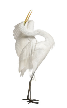 Great Egret or Great White Egret or Common Egret, Ardea alba, standing in front of white background