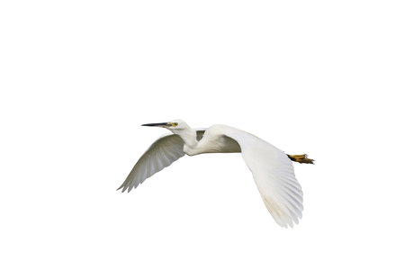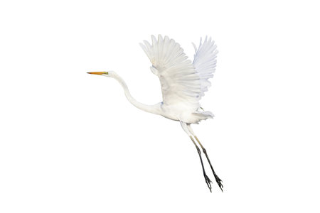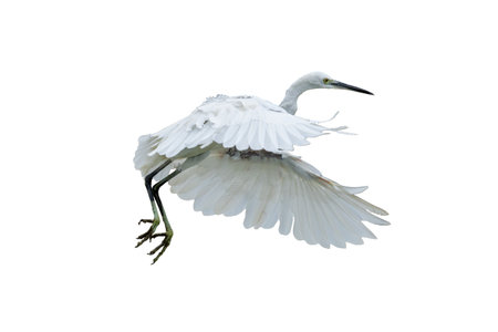 Beautiful flying Egret isolated on white background.