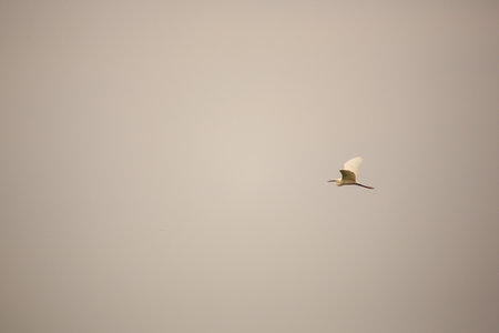 flying Great White Egret with blue sky background