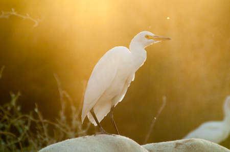 Little egret standing on the wooden pier in the morning light.