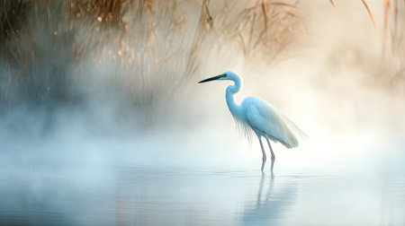 A stunning image capturing a Great Egret standing in the serene water, enveloped in mist with soft reeds in the background. Ideal for nature lovers.