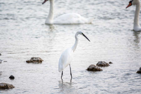 The small white heron or Little egret stands in the lake. Small White Heron, lat. Egretta garzetta, looking at fish in shallow water