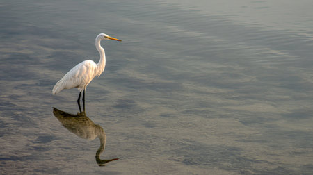 A white heron stands on shallow azure water. wildlife background in soft morning light. tranquility and tranquility.