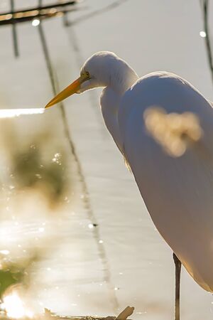 Great or common egret (Ardea alba) with pure white plumage, long neck and yellow bill standing on a wooden platform in a pond and cleaning its feathers in sunlight