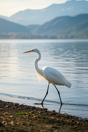 Great egret standing on the shore of a lake in Scotland.