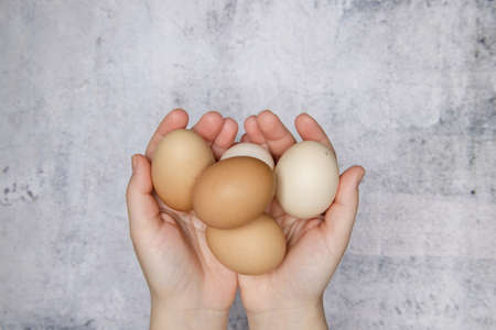 hands of an invisible person are holding fresh chicken eggs from the farm. gray background free space