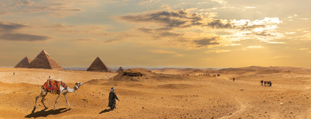 Panoramic view of the six great pyramids of Egypt with a camel in front. Pyramid of Khafre, pyramid of Khufu, and the red pyramid.