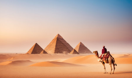 A man rides a camel in the desert near the Great Pyramids of Giza