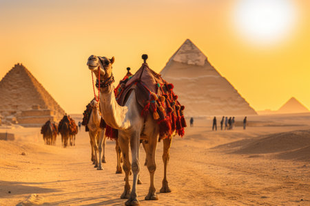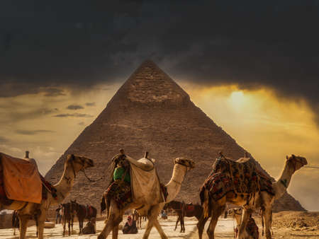 Camel caravan resting near Great Pyramid at Giza during sunset with colorful decorations and desert landscape
