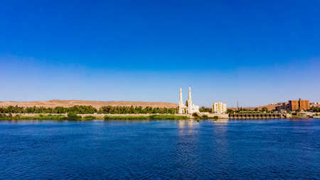The El-Tabia Mosque in Aswan, Egypt. Egyptian Mosque Minarets. Aswan Mosque along the Nile River with two minarets.
