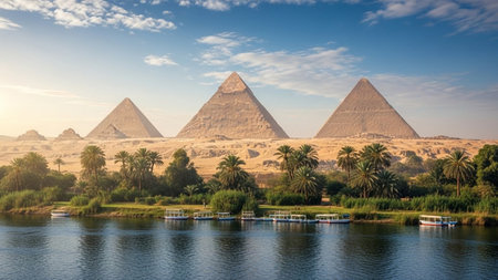 Giza Pyramids Overlooking the Nile River with Palm Trees, Iconic Egypt Landscape Combining Ancient History and Natural Beauty