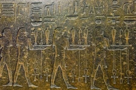 Ancient egyptian paintings and hieroglyphs carved on the stone wall