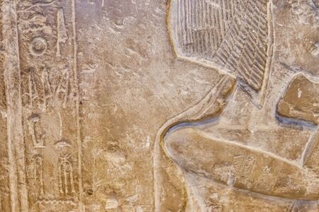 Old drawings cuted in ancient walls in Egypt, Luxor. Horizontal color photo.