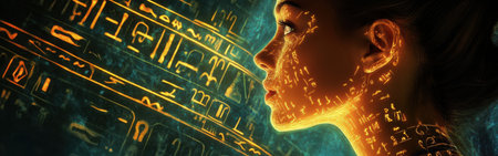 A woman emits a warm glow, her face adorned with ancient symbols. She stands in a dreamlike environment, illuminated by an ethereal light, evoking mystery and wonder.