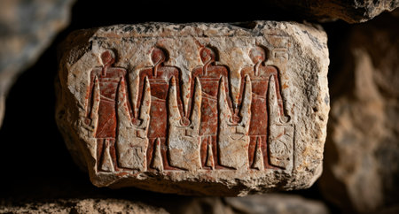 Cuneiform or Egyptian hieroglyphs of Ancient civilization carved on dark stone wall. Undeciphered signs like Sumerian and Babylonian writing. Concept of mystery, old script, puzzle, riddle. Generative AI.