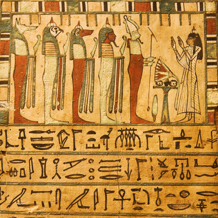 Ancient Egyptian gods and hieroglyphics painted on stone