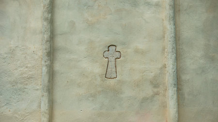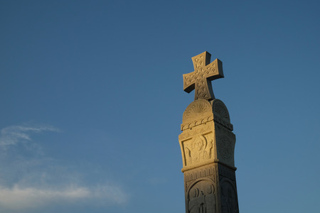 Detail of cross on tombstone in cemetery. Engraving with christian religious symbol in close up with copy space