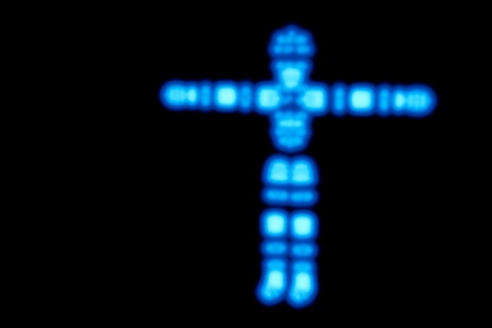 A high angle shot of a cross sign with Jesus print isolated on a yellow background