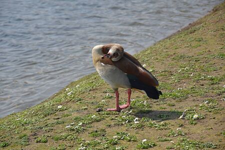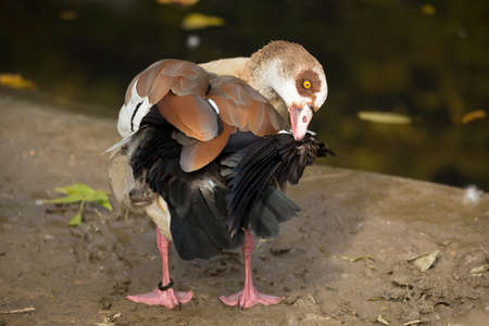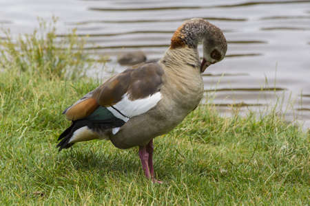 Egyptian Goose, Alopochen aegyptiacus, near water, cleaning her body