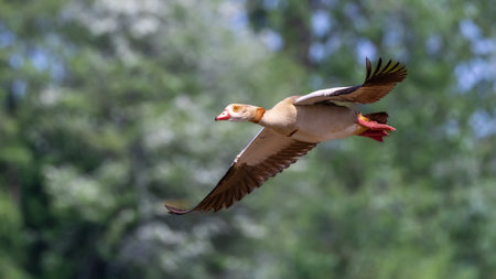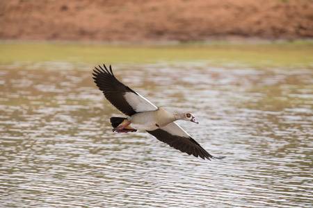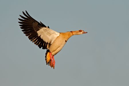 Egyptian goose (Alopochen aegyptiacus) in flight, Kruger National Park, South Africa