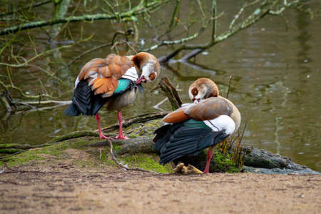 Egyptian geese (lat.- Alopochen aegyptiaca) stands on the shore of a pond