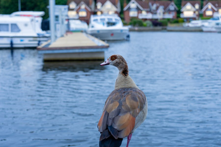 Egyptian goose standing on pier wth Broads waterway and boats in background at Hoveton in Norfolk Broads United Kingdom.