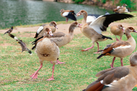 Group of nile gooses in motion in the national park of Ramat-Gan, Israel