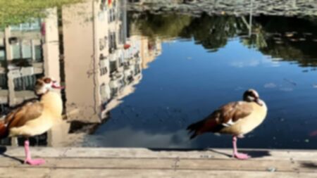 A selective focus of Nile geese on the lakeshore against a blurred background