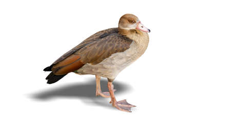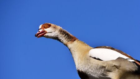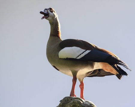 A wild goose sits on a light background. The Egyptian goose screams with its beak open. Bottom view, a bird in breeding plumage,