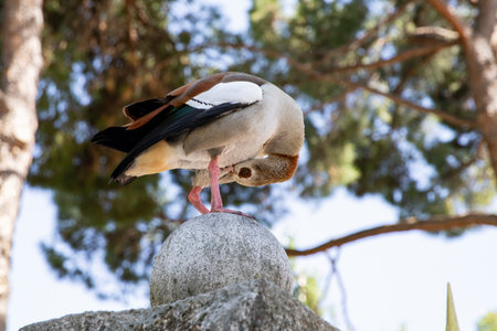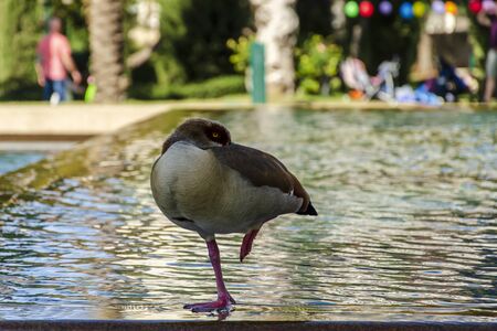 Nile goose Alopochen aegyptiaca or Alopochen standing on one paw hid a beak under the wing with one open eye on the side of the fountain in a park in Israel