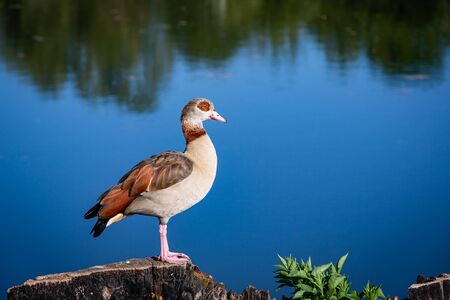 Egyptian Goose (alopochen aegyptiacus) resting on one leg by the edge of a still pond.