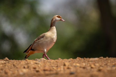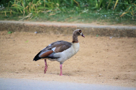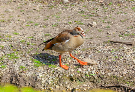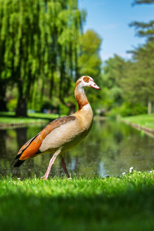 Egyptian Goose Strolling by the Lakeside in a Lush Green Park on a Sunny Day.