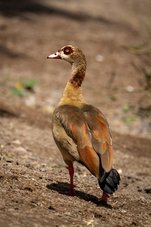 Egyptian geese have long necks, long pink legs, a pink bill and brown eye patches encircling each eye.